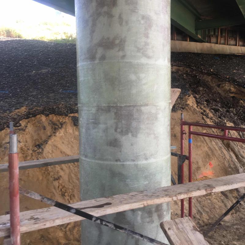 Project consisted of excavating, forming and placing concrete for footings. Surface repairs to concrete columns. Composite fiber wrapping and coating of columns. Forming and placing concrete new barrier wall.